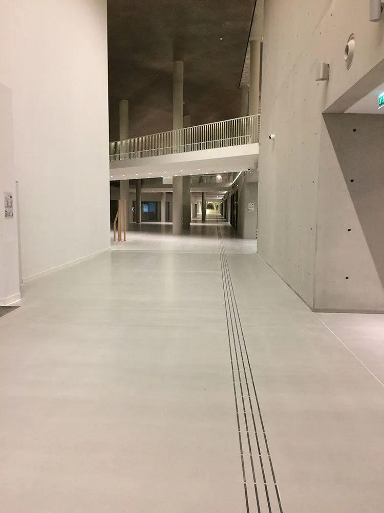 È stato scelto l’eccellente Ultratop Sytem effetto naturale autolivellante resin-cementizio nel colore grigio chiaro per tutte le vie di circolazione interne, che portano dal foyer all’auditorium.