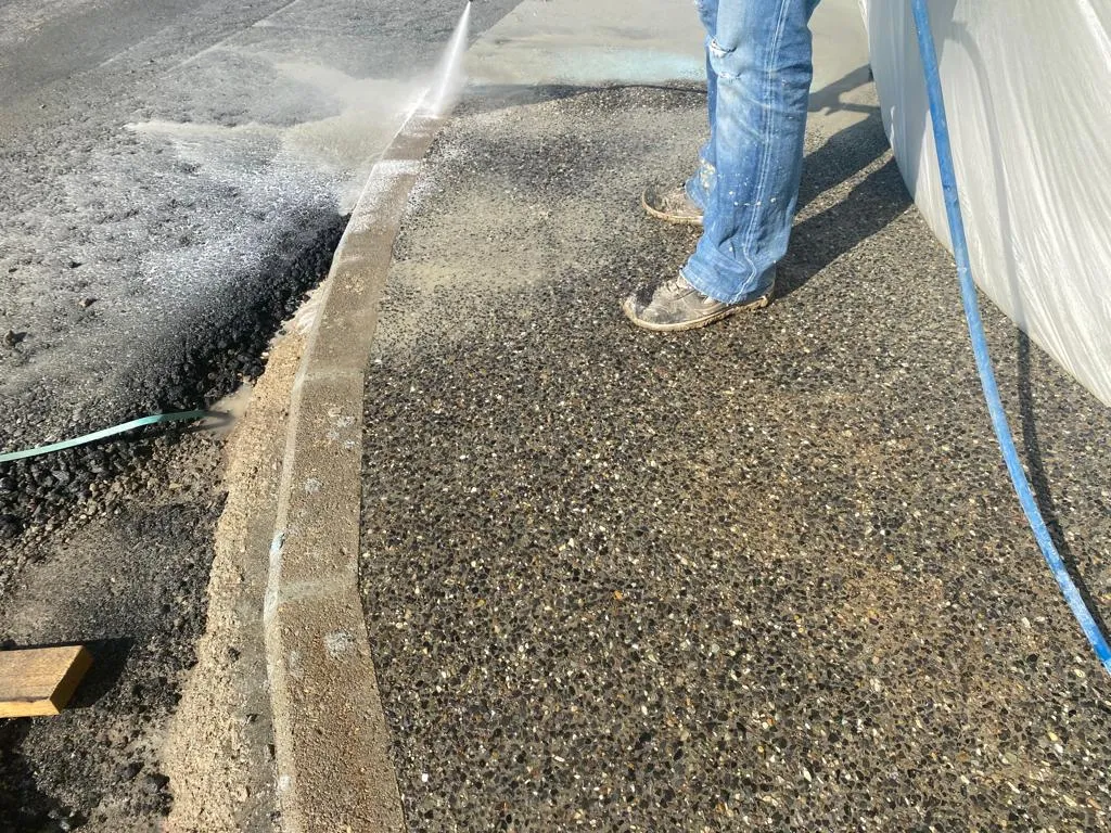 All’esterno, stiamo realizzando i marciapiedi, ovvero una pavimentazione in calcestruzzo architettonico per esterni monolitica, continua in sasso lavato a vista Prima Ground®
